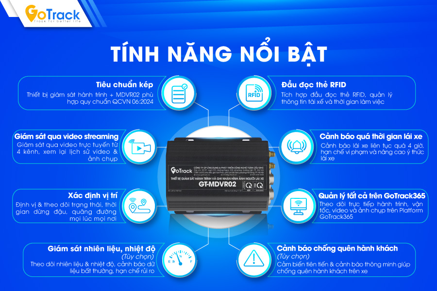 GoTrack GT-MDVR02 với Module được nâng cấp lên tính năng ghi video trực tuyến và tích hợp Module định vị GPS đạt quy chuẩn QCVN 06:2024/BCA, mọi dữ liệu đều được theo dõi từ xa qua hệ thống phần mềm thông minh của GoTrack.