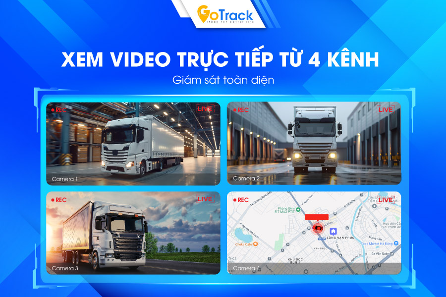Xem video trực tiếp lên tới 4 kênh cùng lúc, theo dõi đồng thời các thông tin về thời gian chụp, tốc độ và địa chỉ hiện tại của xe trên online.
