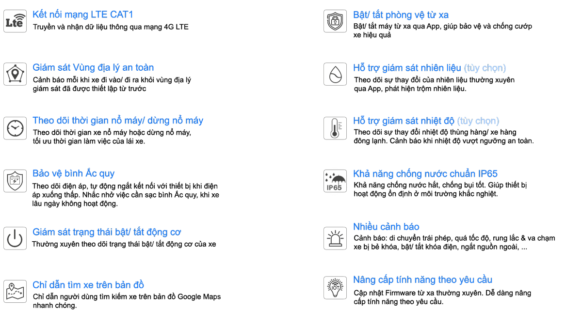 | Đèn Led | 2 LED: GPS-Blue, 4G-RED |